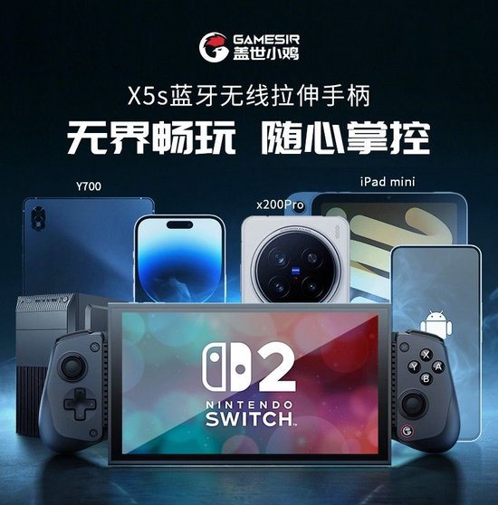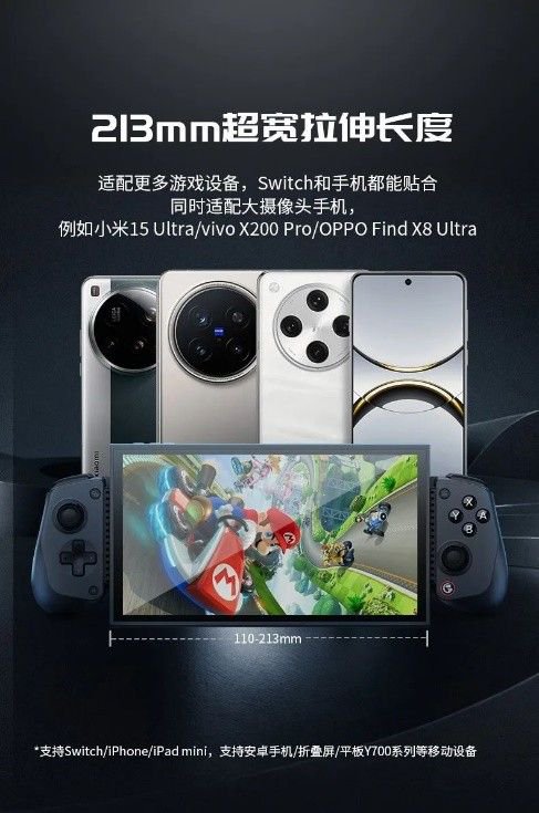 在配置兼容方面,X5s手柄的超宽拉伸长度长达213mm,完美适配Switch 2/折叠屏/Y700平板以及主流大摄像头手机等移动设备。