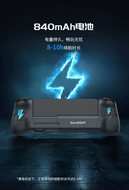 在续航方面,840mAh电池,满电状态下,正常游戏续航时长可达8-10h,畅玩无忧。